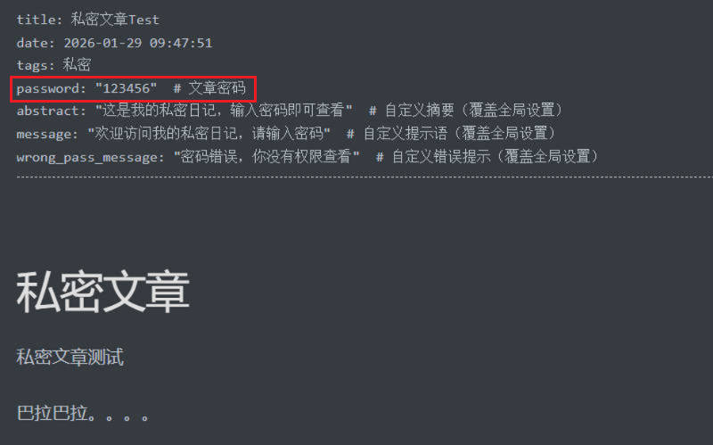 创建文章,在文章头部添加 password 字段,示例如下: