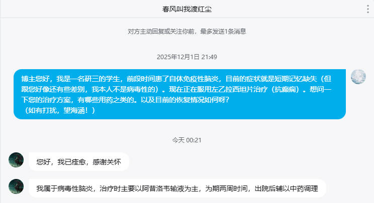 我昨晚在b站搜索了一下“自体免疫性脑炎”的词条,发现了一位up主,名叫“春风叫我渡红尘”(春风叫我渡红尘的个人空间-春风叫我渡红尘个人主页-哔哩哔哩视频)。这位up主共发布了11个视频,记录了他患“病毒性脑炎”后恢复的过程。