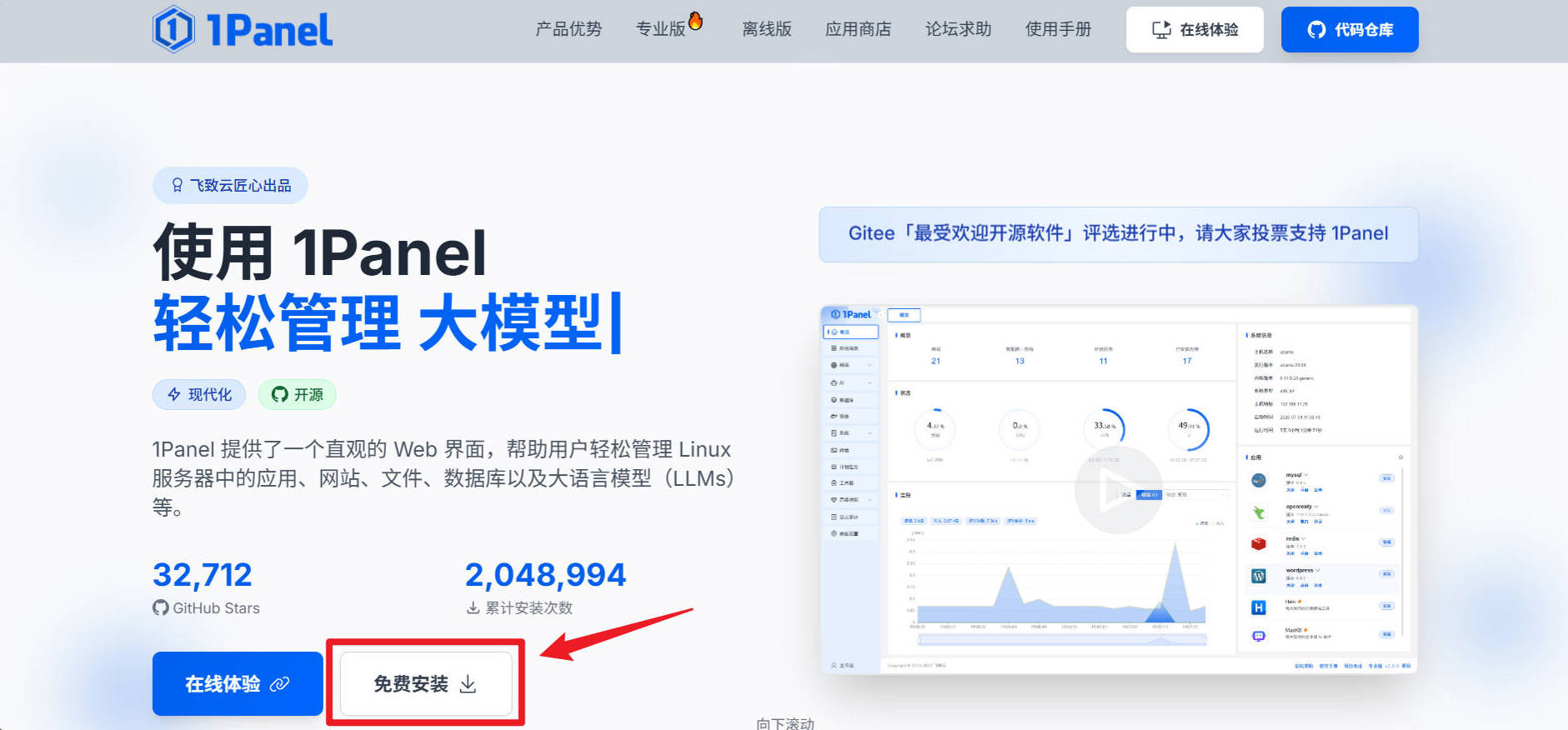 点击链接进入1Panel官网官网,点击免费安装。