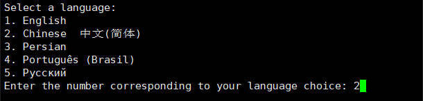 根据指示选择语言(键入 “2” 选择 中文(简体))