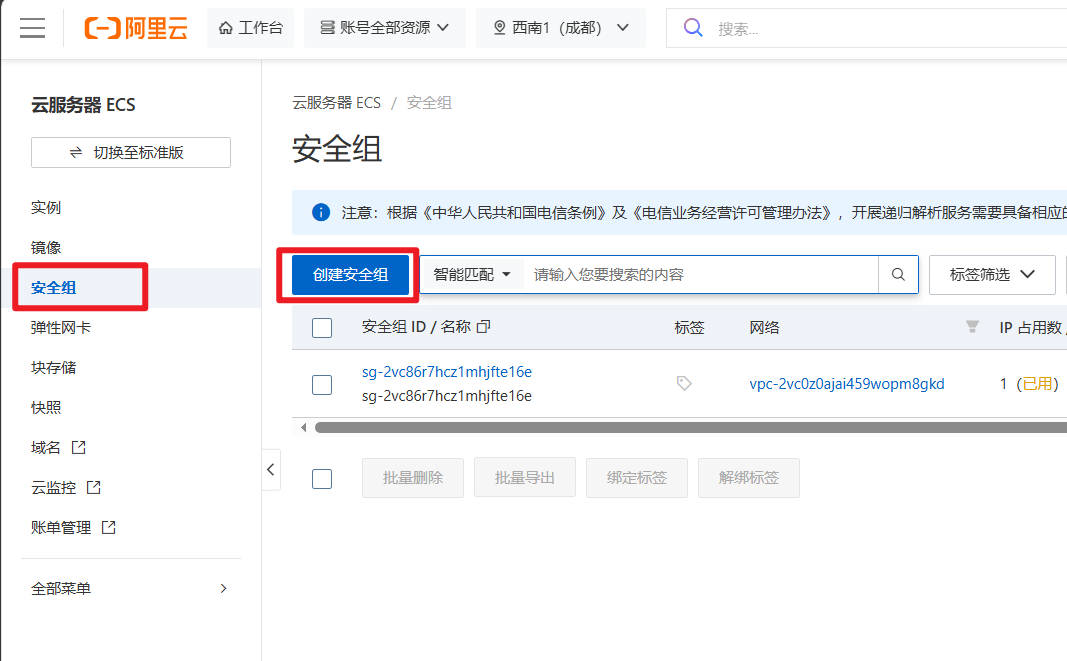 点击安全组选项,并创建安全组。