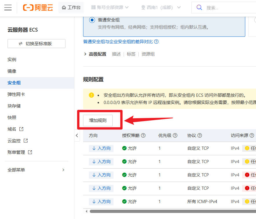 点击增加规则,新建安全组规则。