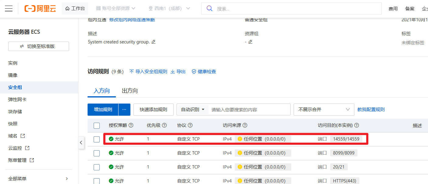 根据提示,需要在安全组中打开端口:14559。(这里用的是阿里云的服务器)