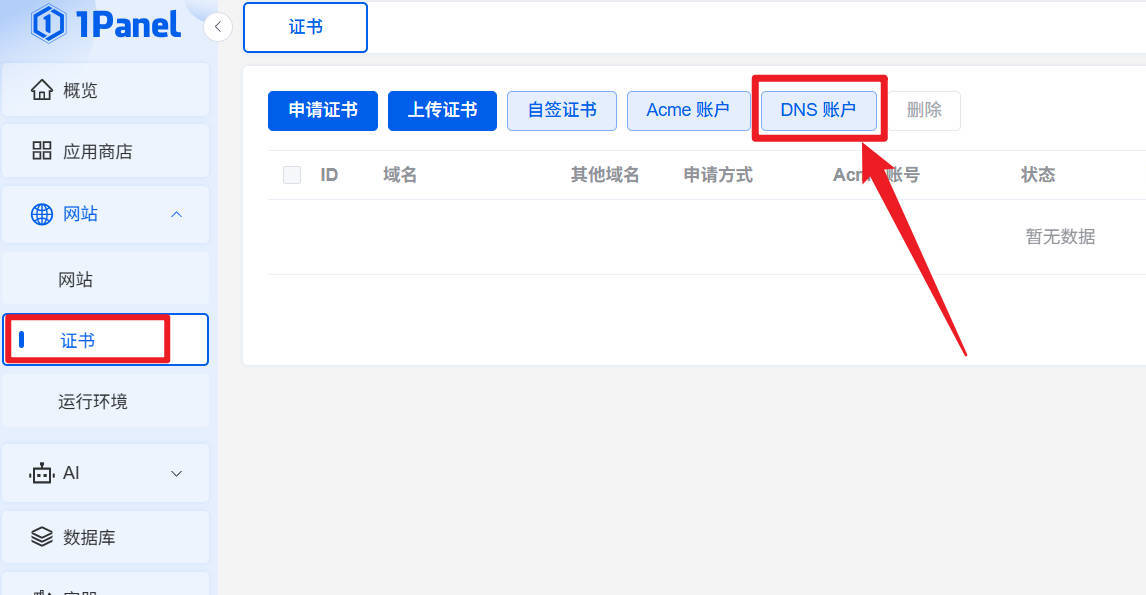 点击网站选项,点击证书二级选项,并创建DNS账户。