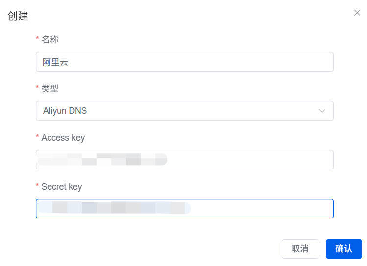 最后将生成的AccessKey ID和AccessKey Secret添加至上述创建DNS面板对应的Access key和Secret key栏当中。