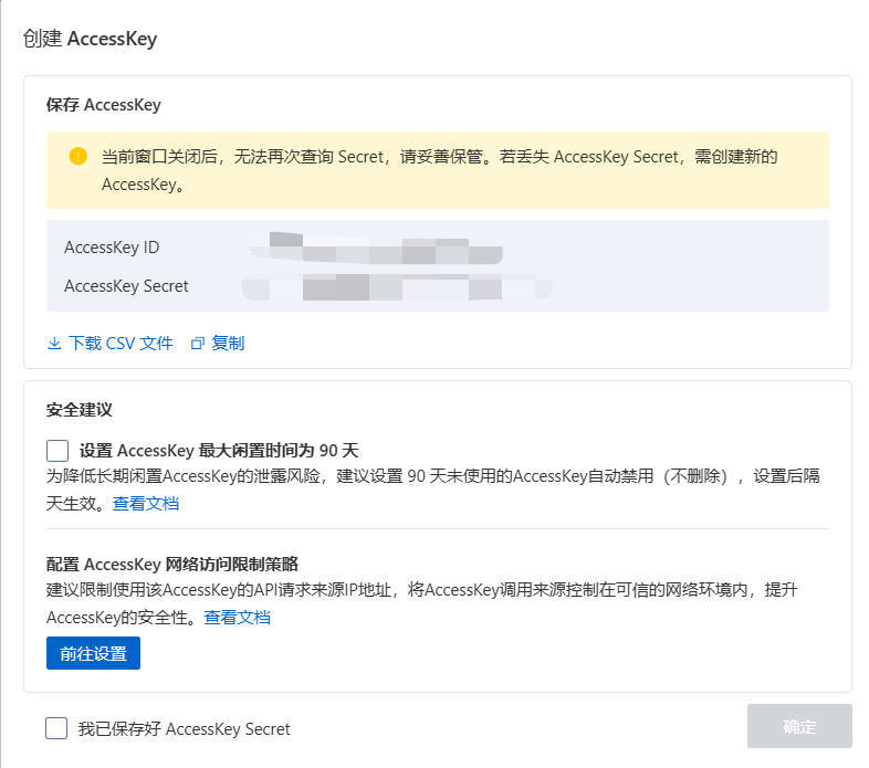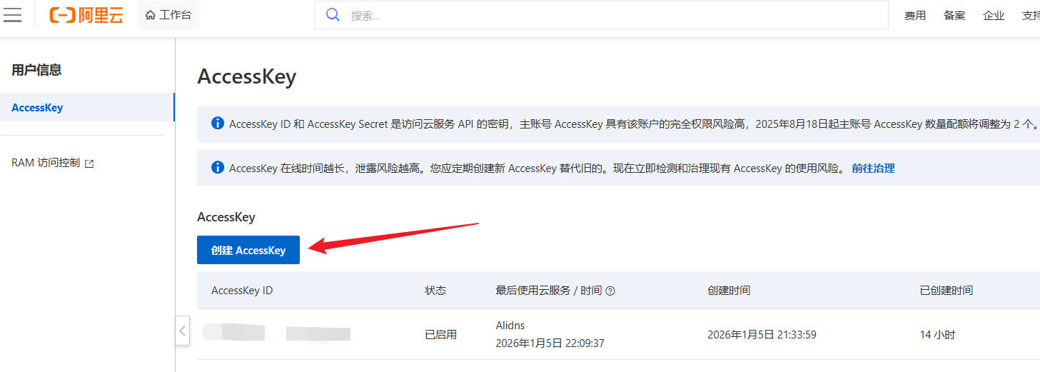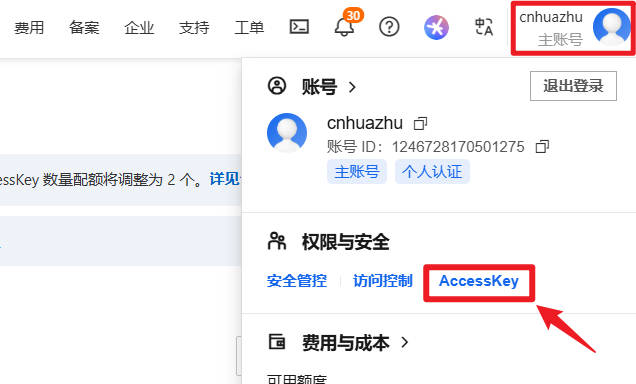 这里需要额外在阿里云中创建Access key,步骤如下: