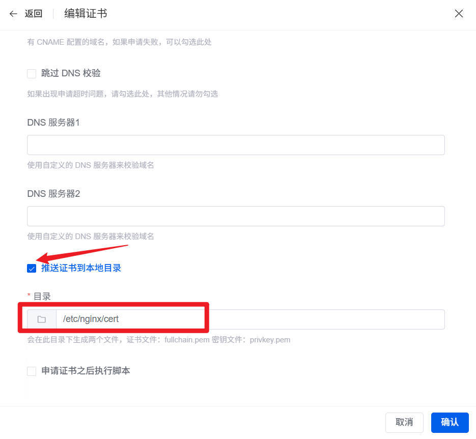 勾选推送证书到本地目录,并设置证书的推送目录。